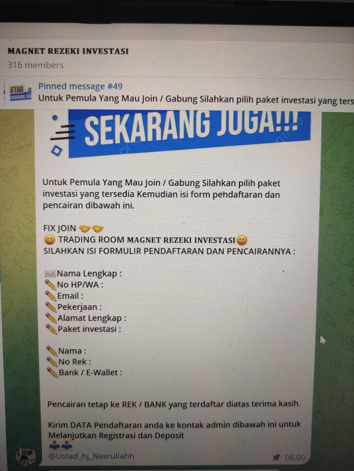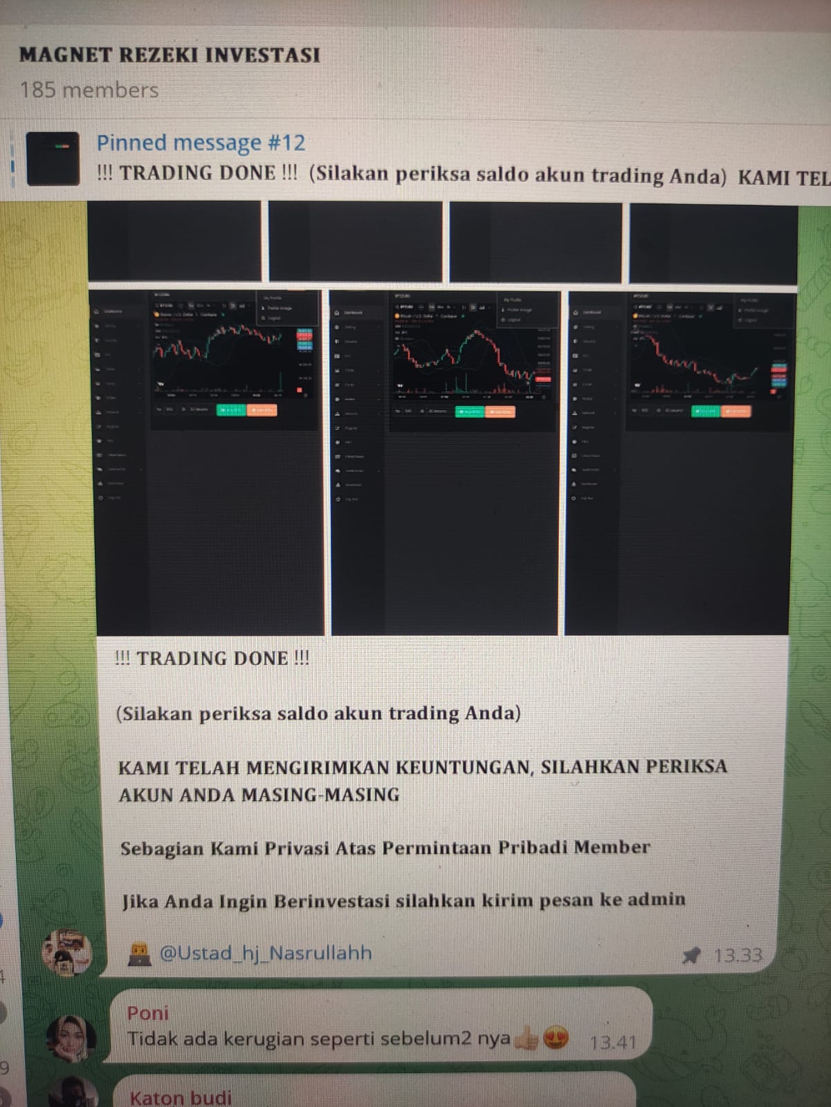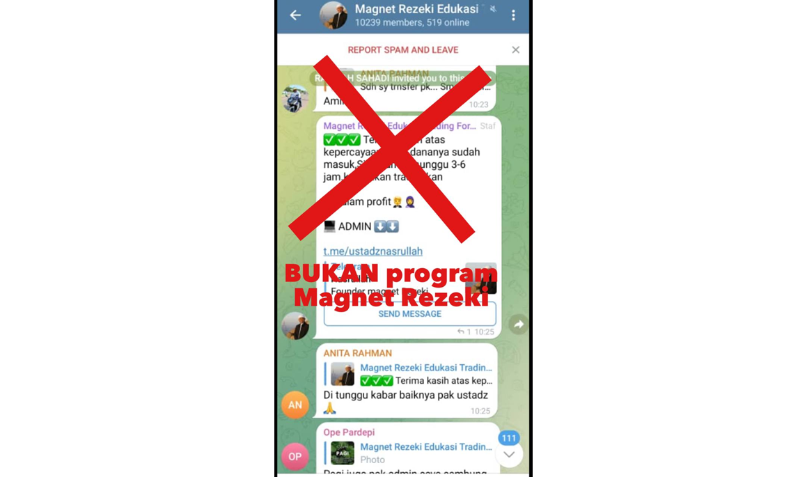Mohon saling mengingatkan di grup atau komunitas masing-masing agar tidak tertipu oleh ajakan investasi atas nama Magnet Rezeki. Jika ragu, laporkan kepada kami.